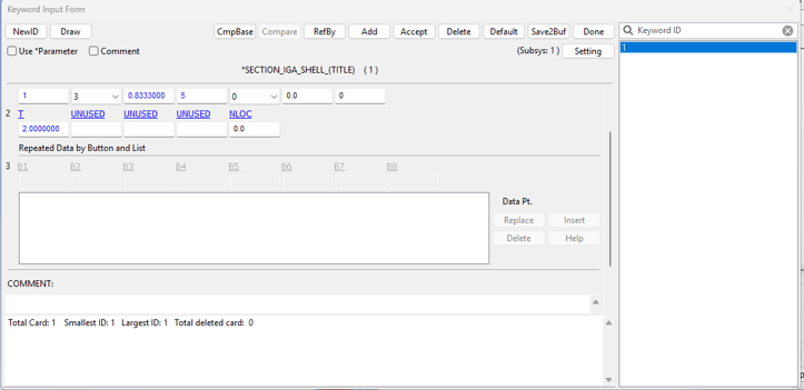 The next step is to define a *SECTION_IGA_SHELL card that will be used to define the section for the parts in our model. The specific parameter values used in this example are shown below.