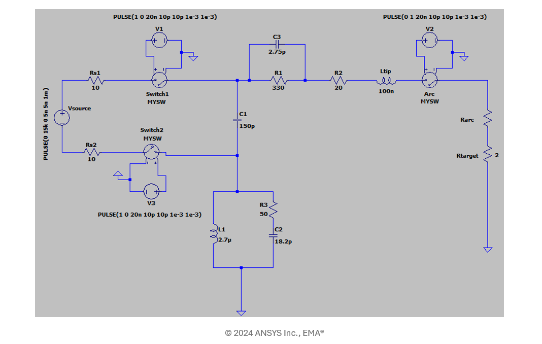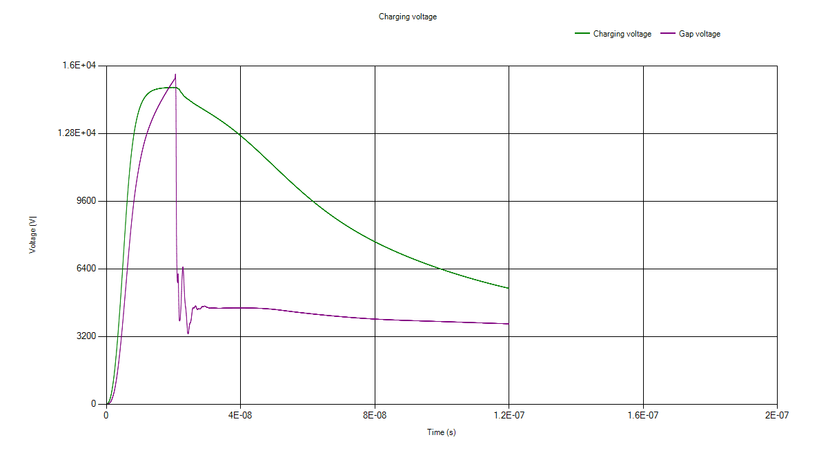 The air ESD into calibration target simulation is an FDTD application that models the discharge of a high-voltage ESD gun into a calibration target using nonlinear air chemistry. In this example, the ESD gun is configured for 15 kV and discharges into a 2 Ω calibration target.