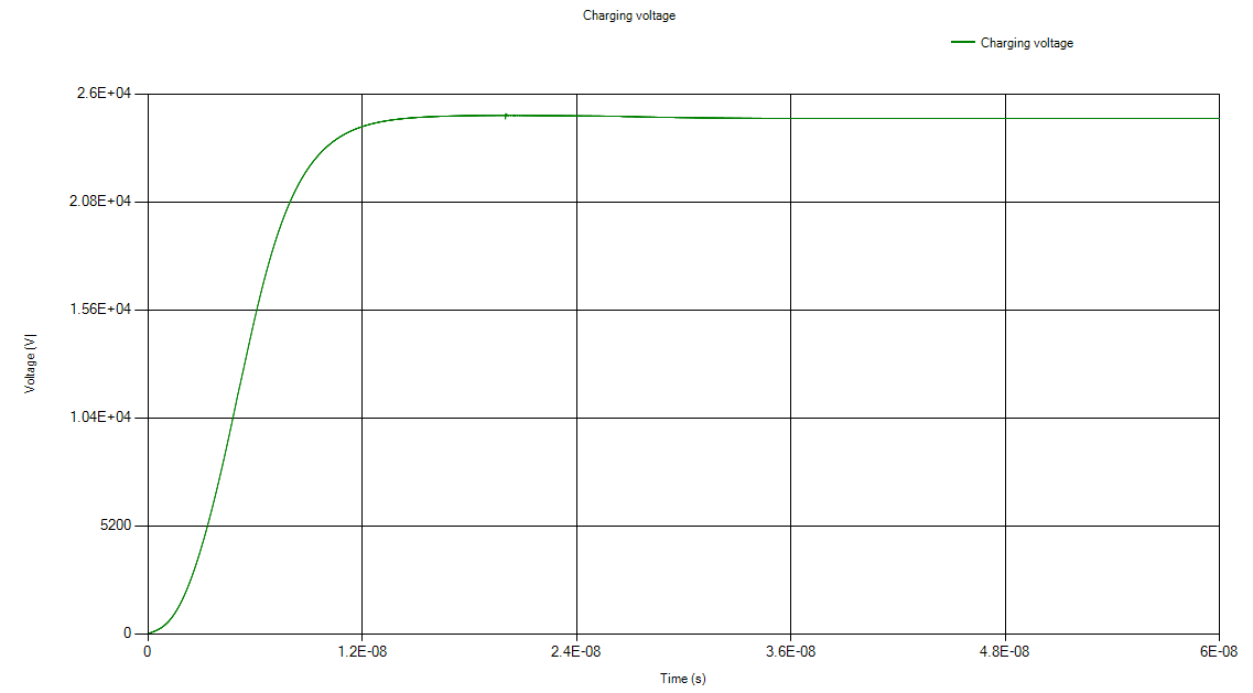 For this example, the source voltage was set to 25 kV. The source voltage and the ESD waveform are shown below.