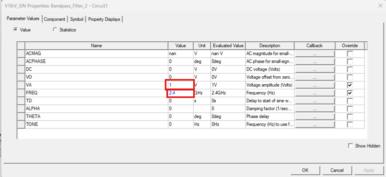 In the transient tab below, we show an example of defining a sinusoidal signal with a frequency of 2.4 GHz to compare with the circuit transient simulation.