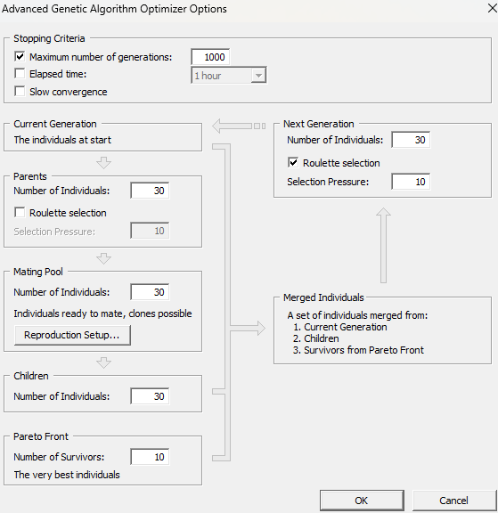 | Nonlinear Programming by Quadratic Lagrangian (Gradient) (NPQL) | For smooth, differentiable problems. Used for final design tuning or as a follow-up after a random search technique such as MOGA.Best for a small number of variables or when one objective dominates. | Uses Lagrange multipliers and quadratic subproblems; may fail with discontinuities. After each iteration, the program approximates the goal with a quadratic function. Can get stuck in a local minimum. |