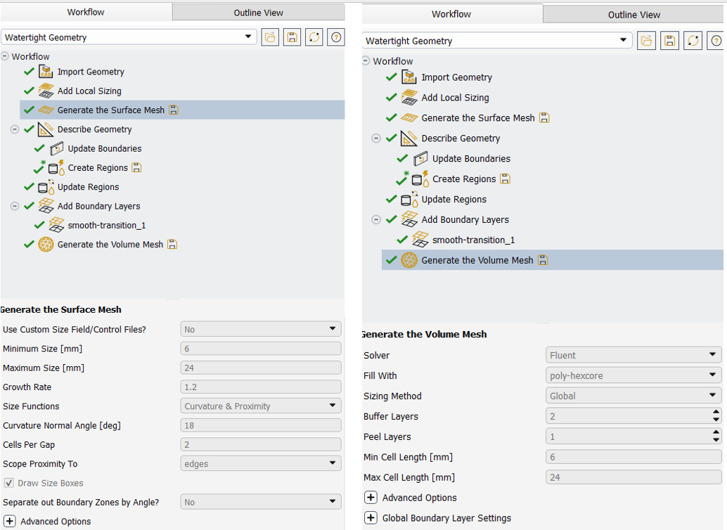 Meshing the geometry for flow solution is done using the Fluent Meshing Mode. The Watertight workflow is used. A surface mesh is generated with a minimum size of 6 mm and a maximum size of 24 mm. The geometry consists of only fluid regions. All fluid-fluid boundary types are set to be changed from "wall" to "internal." Three boundary layers are added to the walls while using the smooth-transition Offset Method Type. A poly-hexcore mesh is generated using 2 buffer layers, 1 peel layer, a min cell length of 6 mm, and a max cell length of 24 mm.