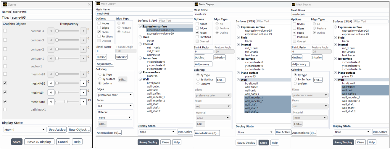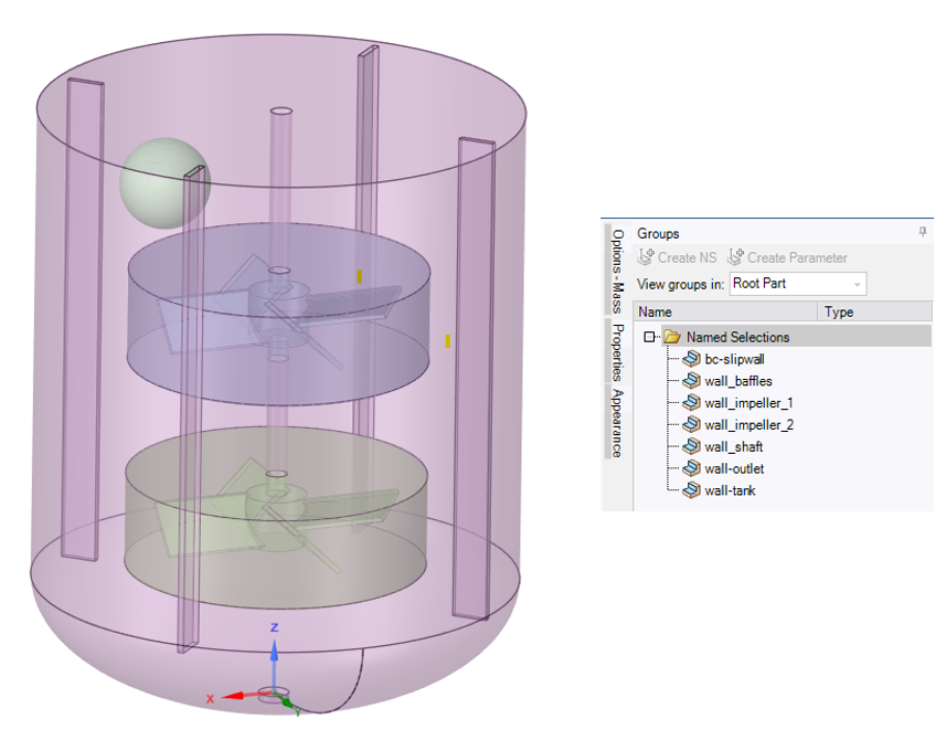 This blog uses an example mixing vessel. The vessel contains two impellers and four baffles. The total liquid volume in the vessel is about 460 Liters. The tracer liquid to be mixed has a volume of 1.77 Liters. The tracer is assumed to be added just below the top surface and in the volume of a sphere. Only fluid-type regions are needed for the Fluent simulation; therefore, the solid bodies are suppressed for physics after being used to generate the fluid volumes. There four fluid volumes: one for the tank, one for each impeller zone, and one for the tracer release zone. The tracer zone geometry is not necessary if one wishes to release tracer from a cell register zone. Topology should be shared between the fluid zones before reading the geometry into the Fluent Mesh Mode. Named Selections are recommended for setting boundary conditions and for post-processing. Below is an image of the mixer with the tracer release zone near the top, and beside it is an example list of named selections for the different walls in the mixer.