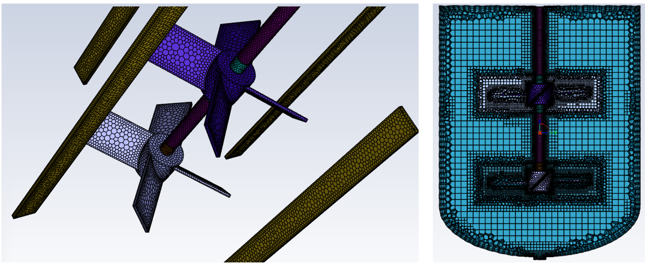 Typical engineering solutions for addressing the challenges of mixing non-Newtonian liquids focus on improving flow, minimizing dead zones, and ensuring adequate shear distribution. Engineers often select impellers that generate strong axial flow—such as pitched-blade turbines or helical ribbon mixers—to promote top-to-bottom circulation in highly viscous or shear-thinning fluids. Baffling is adjusted to prevent vortex formation and increase macro-mixing efficiency. Variable-speed drives allow operators to tune shear rates to match the fluid’s rheology without causing excessive energy consumption or shear degradation. In some cases, dual-impeller configurations or anchor-ribbon combinations are used to balance bulk flow with localized shear. Vessel geometry, such as aspect ratio and bottom shape, is also optimized to reduce stagnant regions and enhance overall uniformity.ANSYS Fluent provides a powerful framework for evaluating these design strategies by simulating complex non-Newtonian rheology and predicting resulting flow fields. Engineers can model different impeller types, speeds, and vessel geometries to visualize circulation loops, shear distributions, and potential dead zones. Using the fractional volume mixed method, Fluent tracks species or tracer dispersion over time, allowing quantitative assessment of how quickly and completely the mixing process progresses. The uniformity index further evaluates the homogeneity of the mixture by comparing concentration deviations across the domain, providing a clear metric for mixing quality. By iterating simulations across various configurations, Fluent helps identify the most effective setups for achieving rapid and complete mixing before physical prototyping.