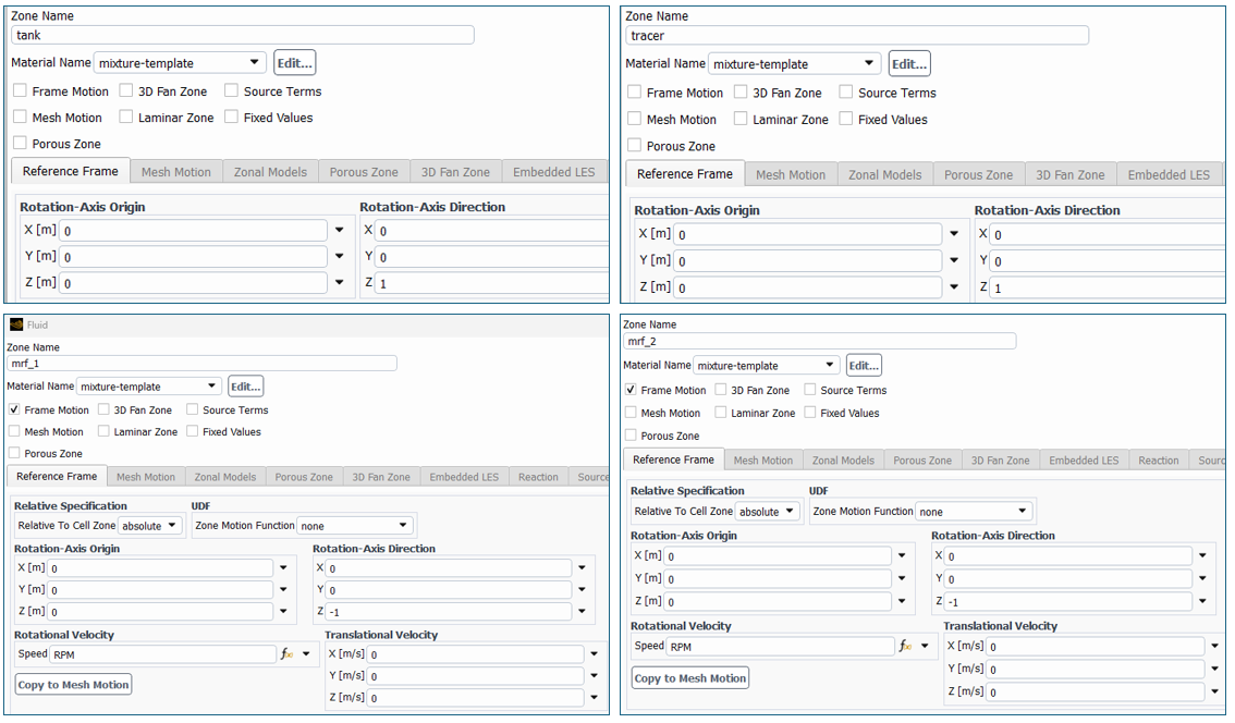 The cell zones all use the same material "mixture-template." The rotating impeller zones use Frame Motion with rotation in the negative Z direction at a rotational velocity given by the named expression "RPM."