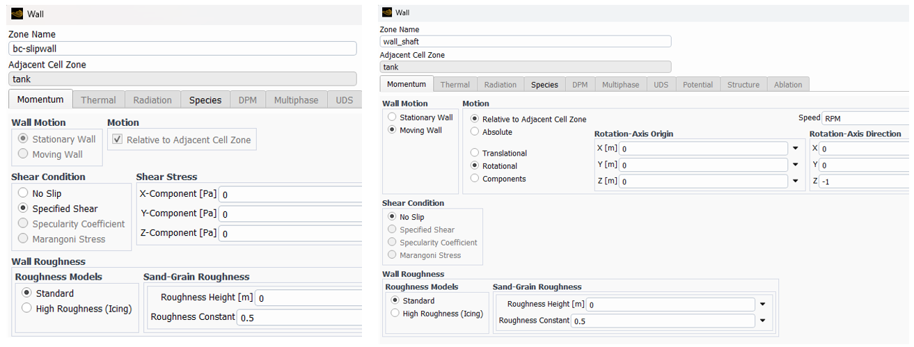 The top surface of the tank is modeled with a zero-shear wall. The shaft walls that are not adjacent to frame motion fluid cells are modeled with rotational velocity.