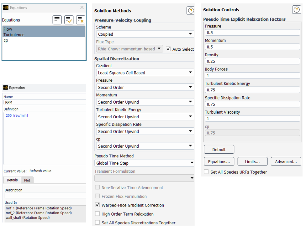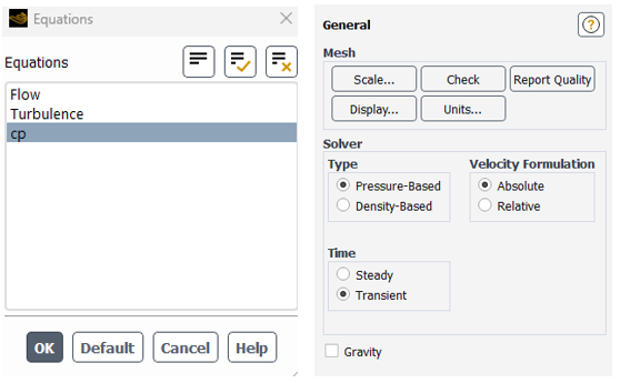 In the transient phase, the flow and turbulence equations are deactivated, thereby freezing the velocity, pressure, and turbulence distributions. The species equation "cp" is activated, and the transient solver is also activated.