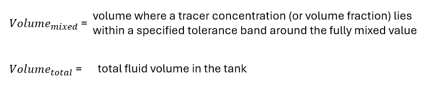 Another method of assessing mixing time is to use Fractional Volume Mixed (or unmixed). Fractional volume mixed describes the portion of the vessel’s liquid volume that has reached a defined level of mixing quality. It answers the question: “What fraction of the tank is adequately mixed?” The equation for this fraction is given as follows.