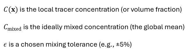 The tolerance is used to calculate lower and upper limits on the tracer concentration about the value of 1.0. For example, a 5% tolerance would result in a lower limit of 0.975 times the ideally mixed concentration, and it would result in an upper limit of 1.025 times the ideally mixed limit. CFD volume mesh elements can be assigned a binary number of 0 or 1 depending on if a mesh element is considered "mixed." The sum of the "mixed" mesh elements is used in the calculation of the Volume_mixed equation above.