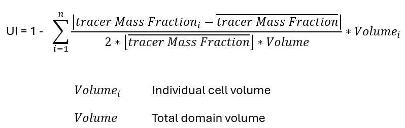 Uniformity index describes the statistical uniformity of the entire tank and indicates how well mixed the tank is overall. Uniformity index is based on global variance of concentration, and a little well-mixed zone can reduce the global variance quickly. Uniformity index detects the start of good mixing in any region of the mixing tank, which can result in quick rise over time.