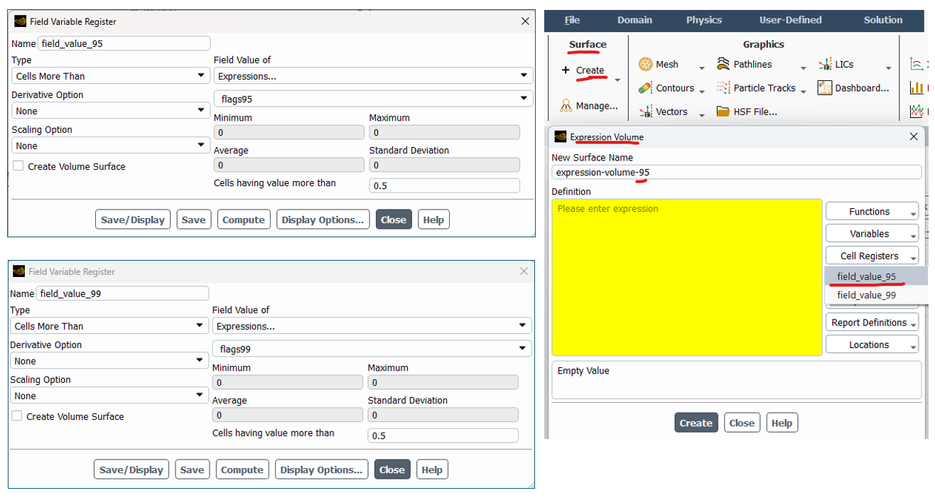 Cell registers based on Field Value are used to capture the mesh element cells that are not mixed for both 95 and 99%. Expression volumes are generated from Surface>Expression Volume to capture the surface representation of the "unmixed" mesh elements.