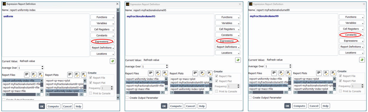 Reports are defined based on the expressions for uniformity index and fractional volumes. Monitor files and plots are generated from these reports.