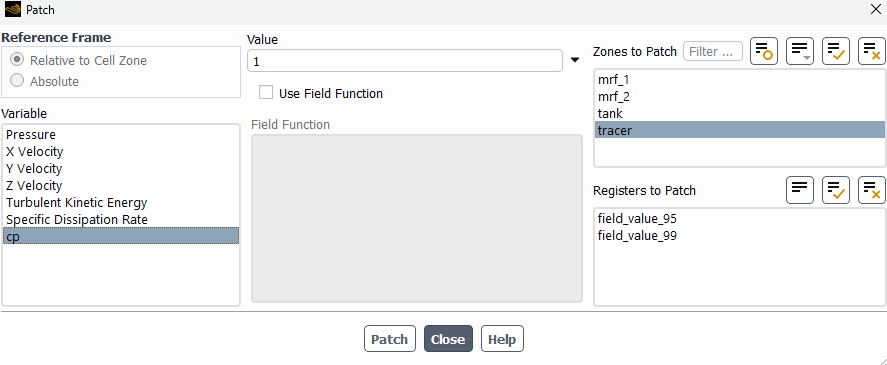 Before starting the transient simulation, the mass fraction of the tracer is set to 1.0 in the tracer release zone using the Patch function.