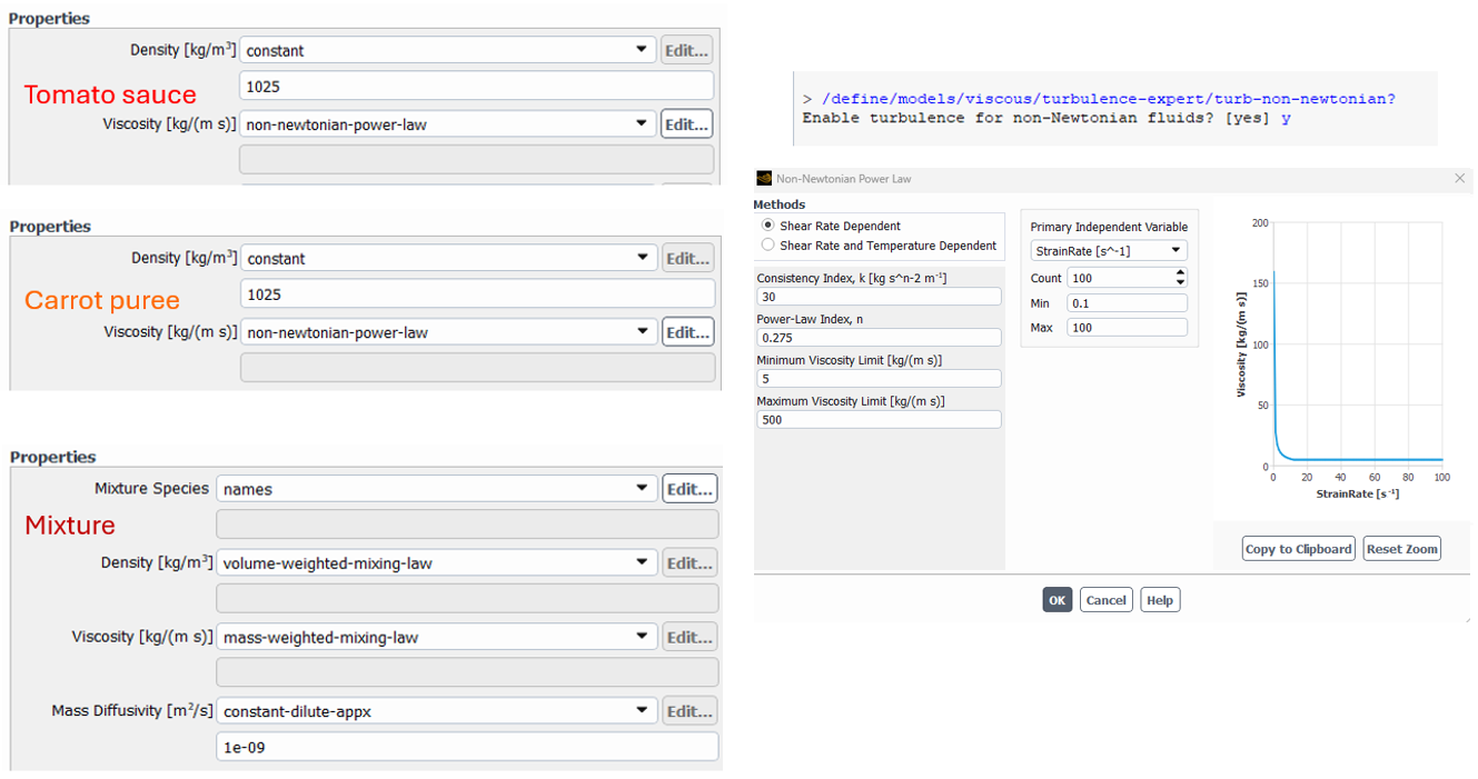 A mixture of tomato sauce and carrot puree are used for the mixture species liquids. Tomato sauce is the majority species; therefore, it is listed last in the list of mixture species. Both fluids are assumed to behave with non-Newtonian behavior. Activating the non-Newtonian viscosity models requires the use of the following Text User Interface command followed by "y" for yes.