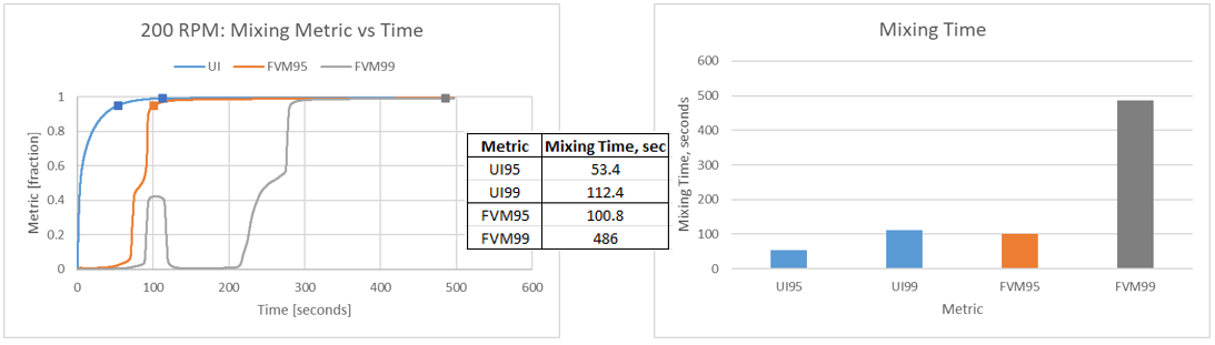 The report files are used to assess the mixing time per the metric of choice: uniformity index, 95% fractional volume mixed, and/or 99% fractional volume mixed. The mixing time for the 95% fractional volume mixed corresponds to the time at which the 95% fractional volume mixed reaches 0.95. The mixing time for the 99% fractional volume mixed corresponds to the time at which the 99% fractional volume mixed reaches 0.99.