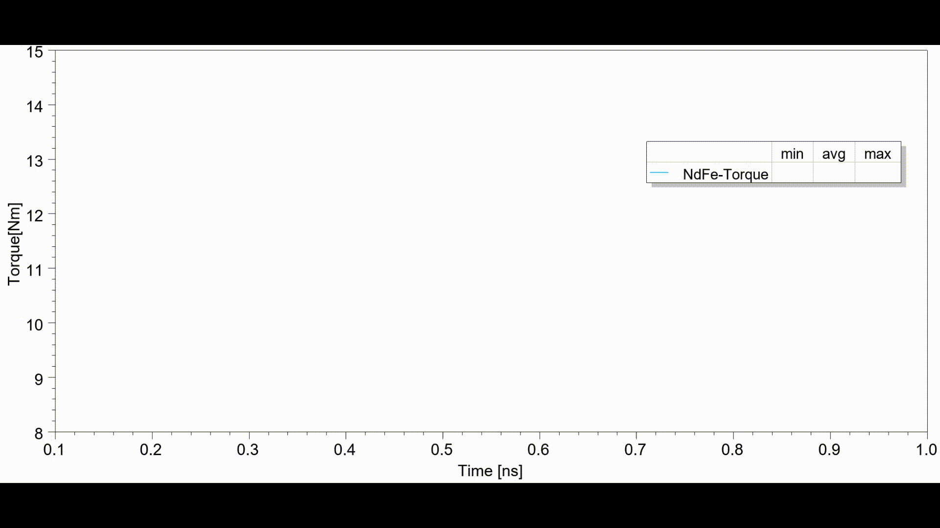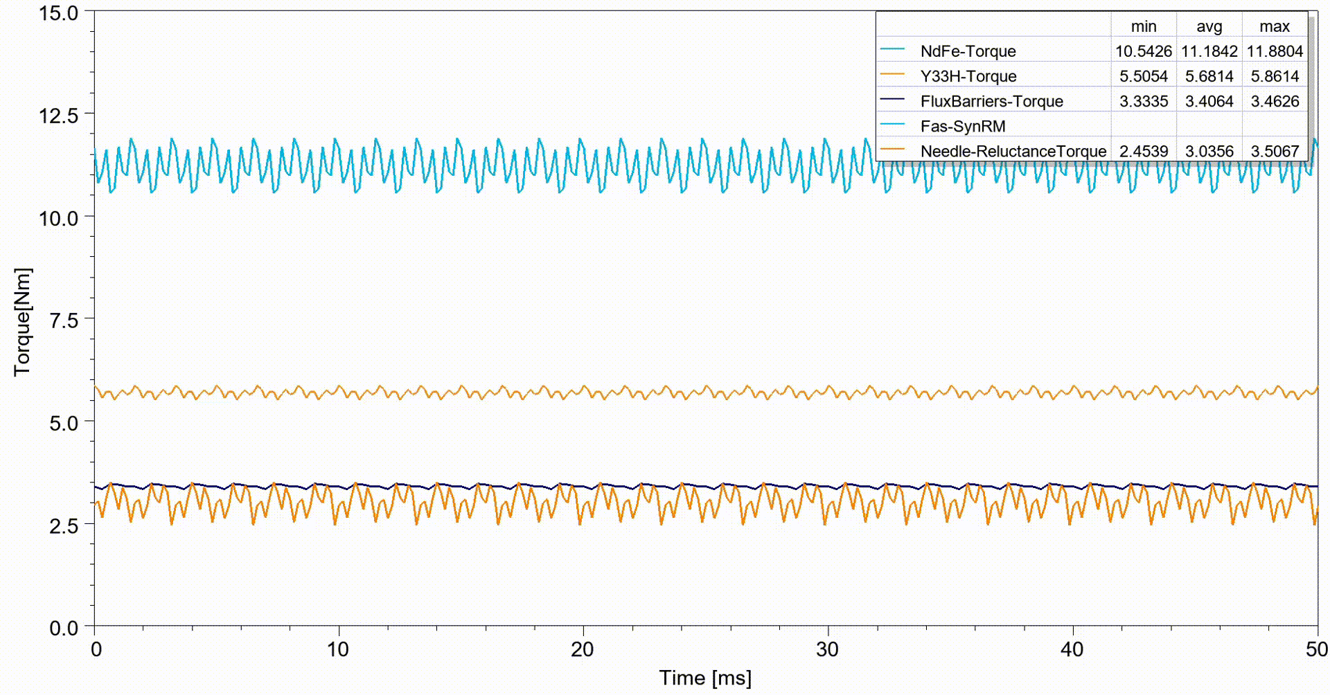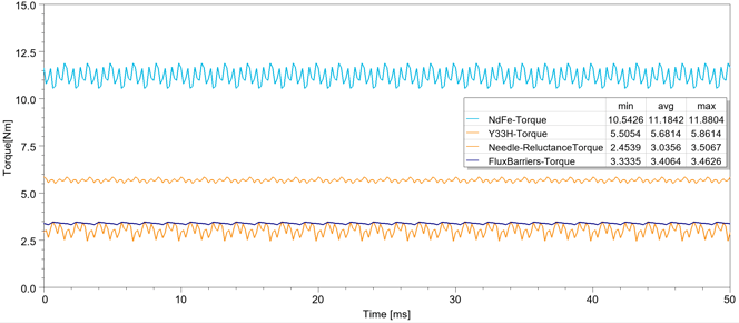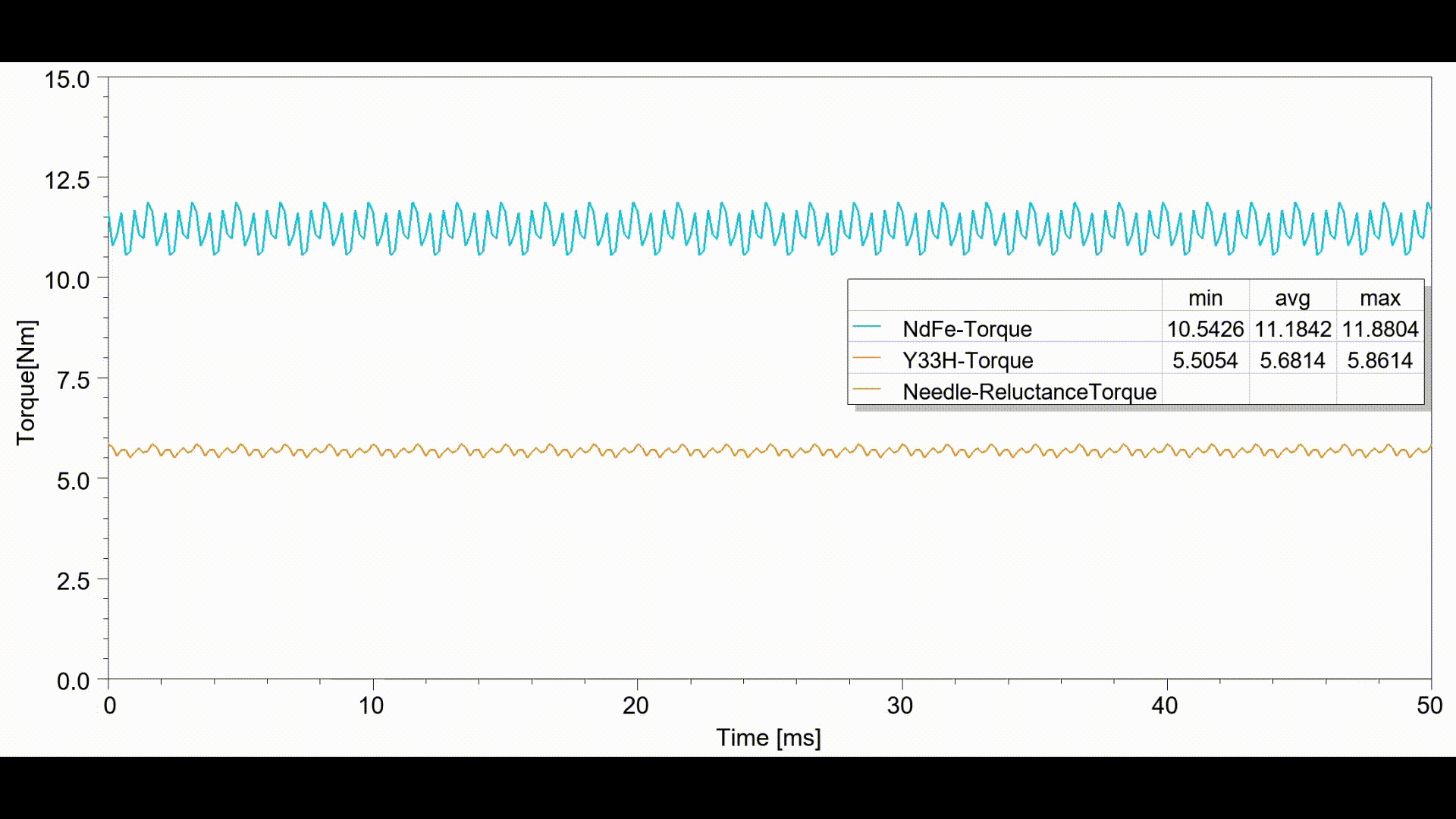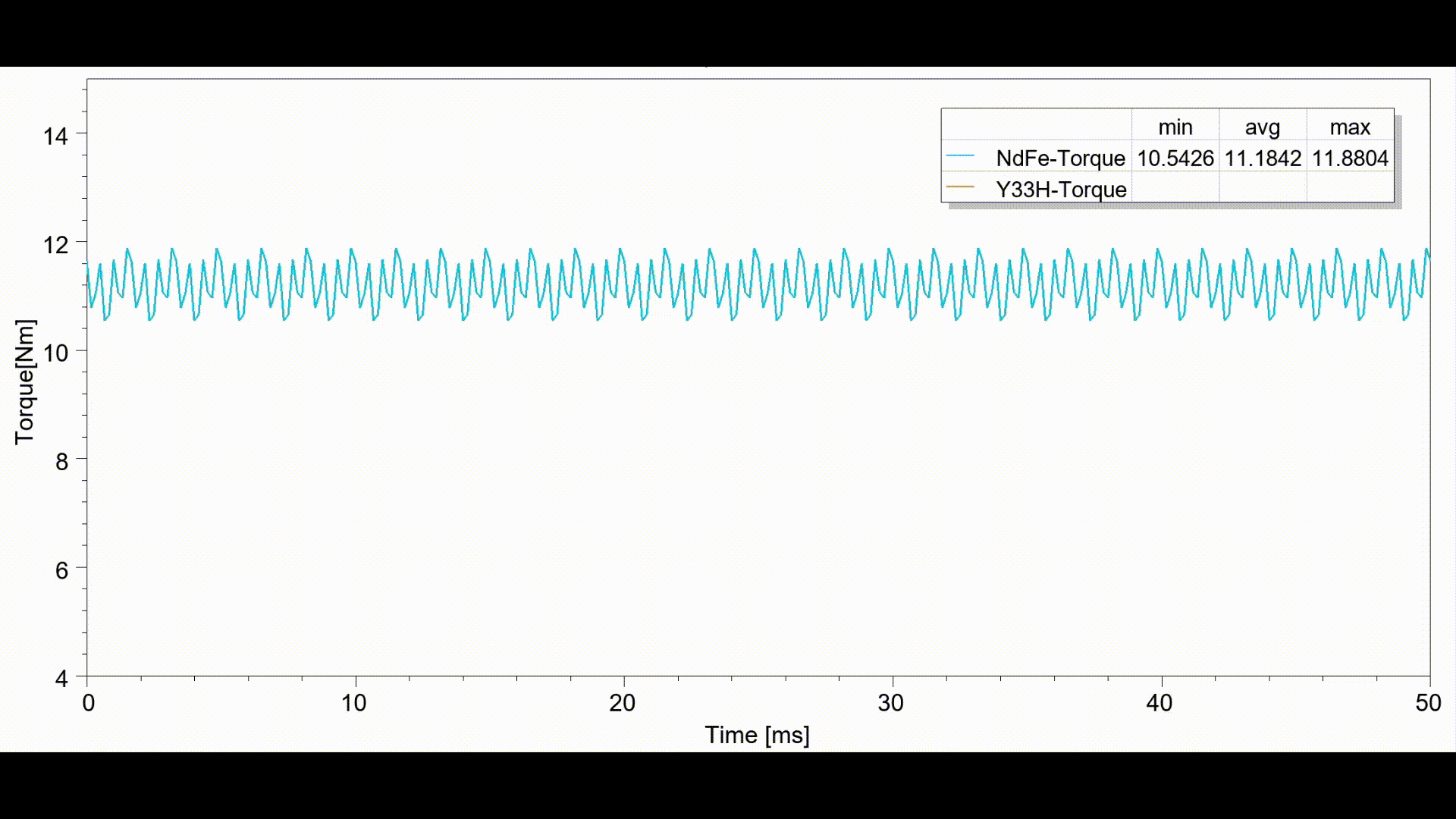 When we simulate the same motor using Y33H magnets, we observe that the ferrite version produces an average torque of 5.68 Nm, which is about half that of the NdFeB version.