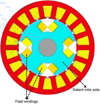 The EESM operates in a way similar to the PMSM. The main difference is that in the EESM, an external excitation source, which creates alignment torque with the stator’s rotating magnetic field, generates the magnetic field in the rotor. For this comparison, the stator dimensions are kept constant to achieve the goal of a direct rotor replacement between motor types.