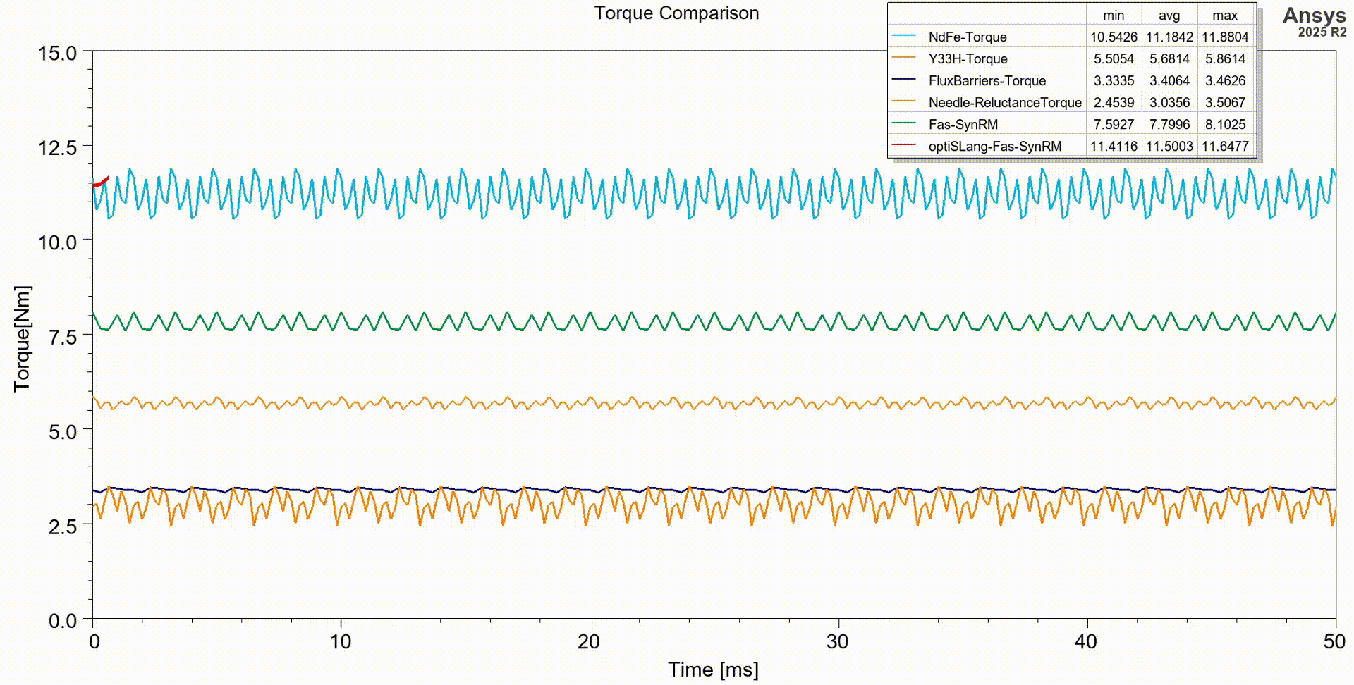 So far, the results and simulations have been conducted in Ansys Maxwell, a general-purpose, high-fidelity electromagnetic simulation tool. However, Ansys also offers a more specialized tool for electric motor analysis called Motor-CAD. Motor-CAD provides template-based FEA solvers tailored for different types of electric motors. When coupled with optiSLang, using its user-friendly optimization interfaces, it becomes an ideal solution for optimizing the Fas-SynRM to achieve a target torque of 11.18 Nm.