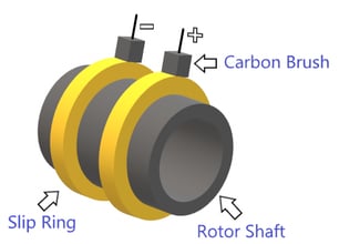 The main difference between an EESM and a PMSM is the presence of brushes and rings in the EESM. These components transfer direct current to the rotor windings through physical contact between the brushes and rings. Two rings — one positive and one negative — are mounted on the shaft, while two brushes (and in some cases more, to improve reliability) make contact with them. Although the brushes are designed to minimize friction and maintain smooth contact, and materials such as carbon are used to increase durability, these parts still require periodic maintenance. Typically, maintenance is needed every ten years, or up to twenty years with newer brush compositions, but they remain components that experience wear over time.