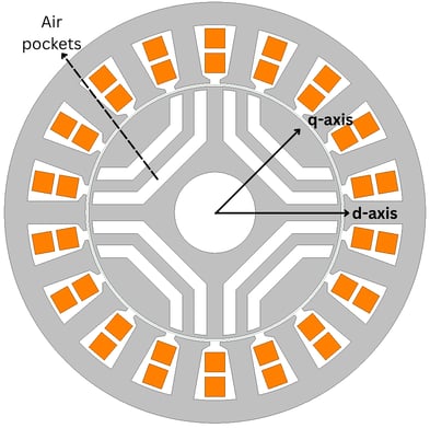 These air pockets create a magnetic reluctance difference between the d-axis and q-axis. In theory, having more or larger air pockets increases the reluctance torque, since the greater the difference in magnetic reluctance between the two axes, the higher the torque contribution. But more flux barriers may result in tight manufacturing tolerances between the barriers and the rotor outer edge.