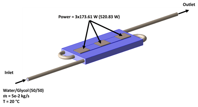 For this demo, we will use a simple cold plate geometry with three heat sources. The case will be solved in a vacuum environment, so the only fluid present is the fluid flowing through the cold plate. More detailed information is shown in the figure below.