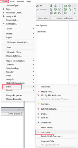 The first step is to access the field calculator by clicking on Icepak in the toolbar, then Fields, and finally Calculator.