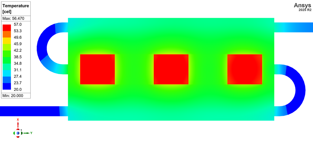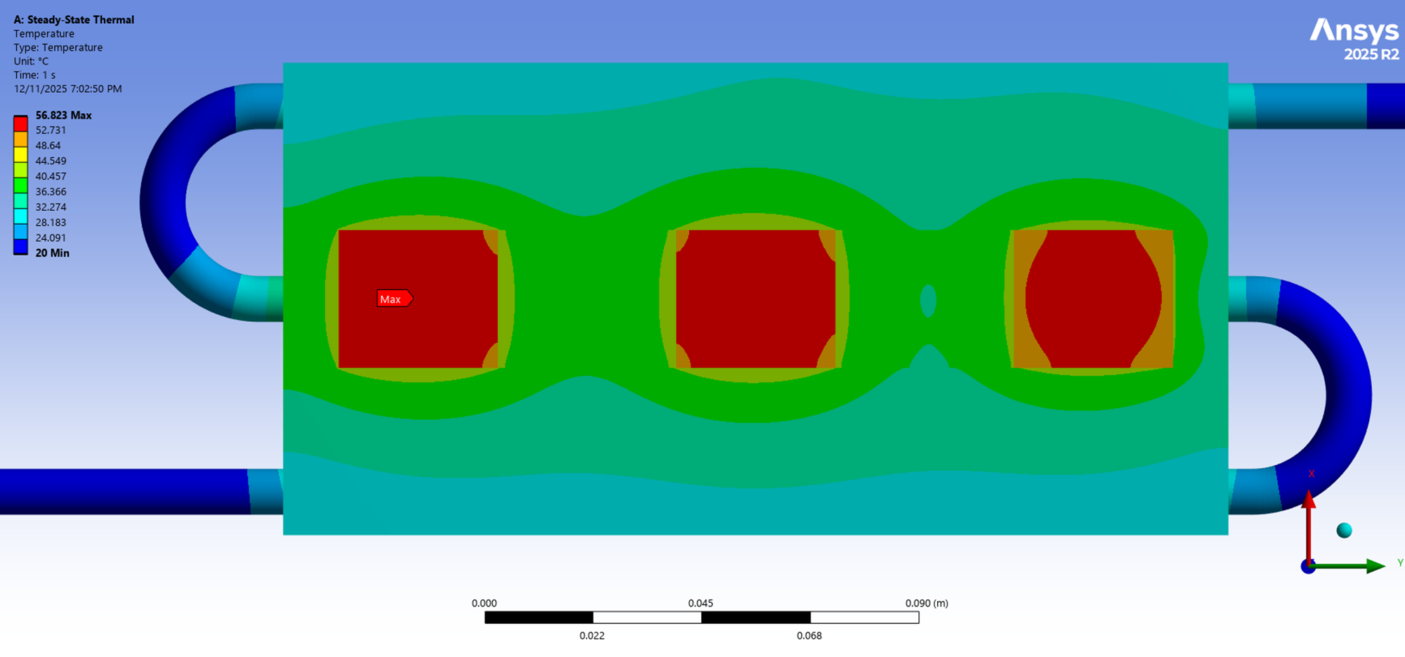 The maximum temperature calculated was similar in both simulations, 56.47 °C in Icepak vs 56.82 °C in Ansys Mechanical, validating the thermal results for our problem. Beyond the peak value, the overall thermal gradient and temperature distribution patterns showed a strong correlation, as shown in the thermal contour comparison below.