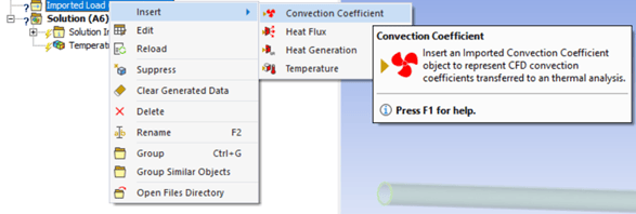 - Now we need to right-click in the Imported Load folder, Insert, and Convection Coefficient.