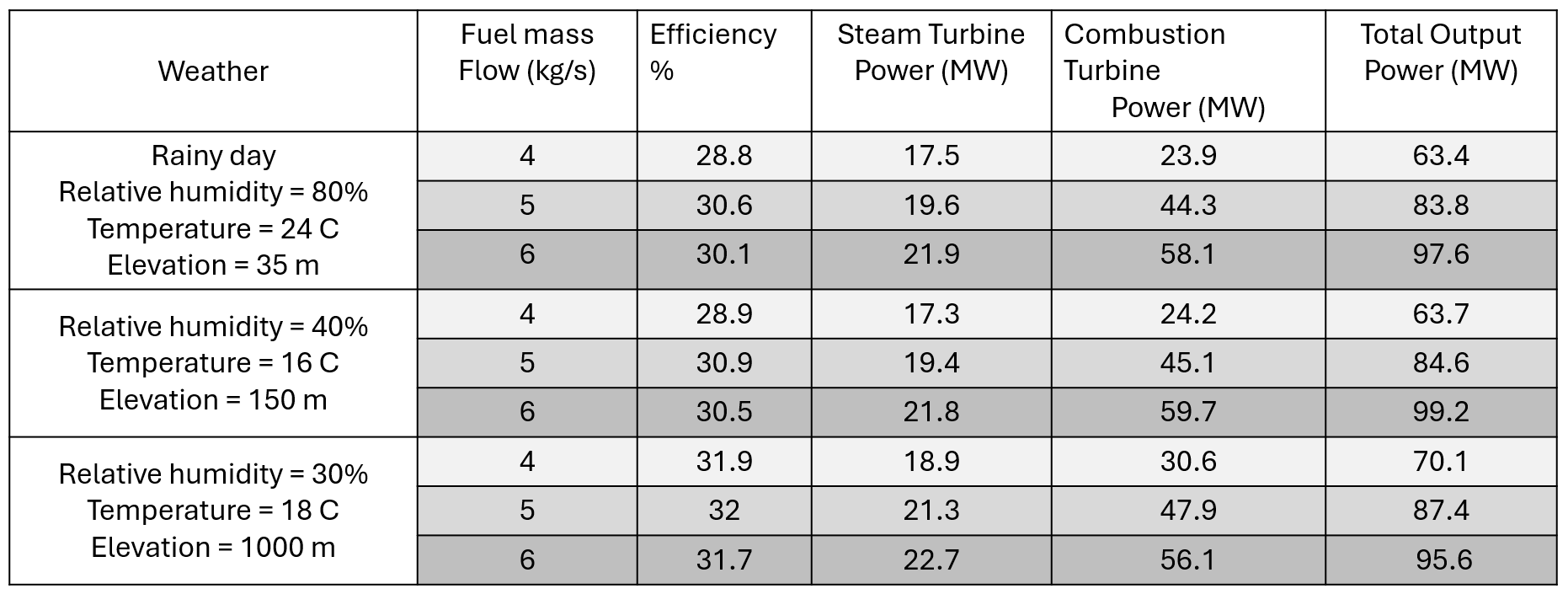 This table summarizes the power outputs and overall efficiency of the power plant when changing the fuel rate and different ambient conditions.