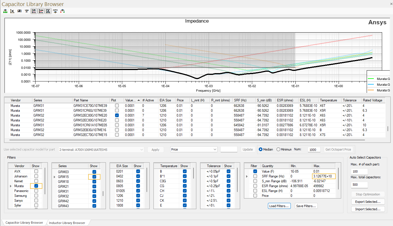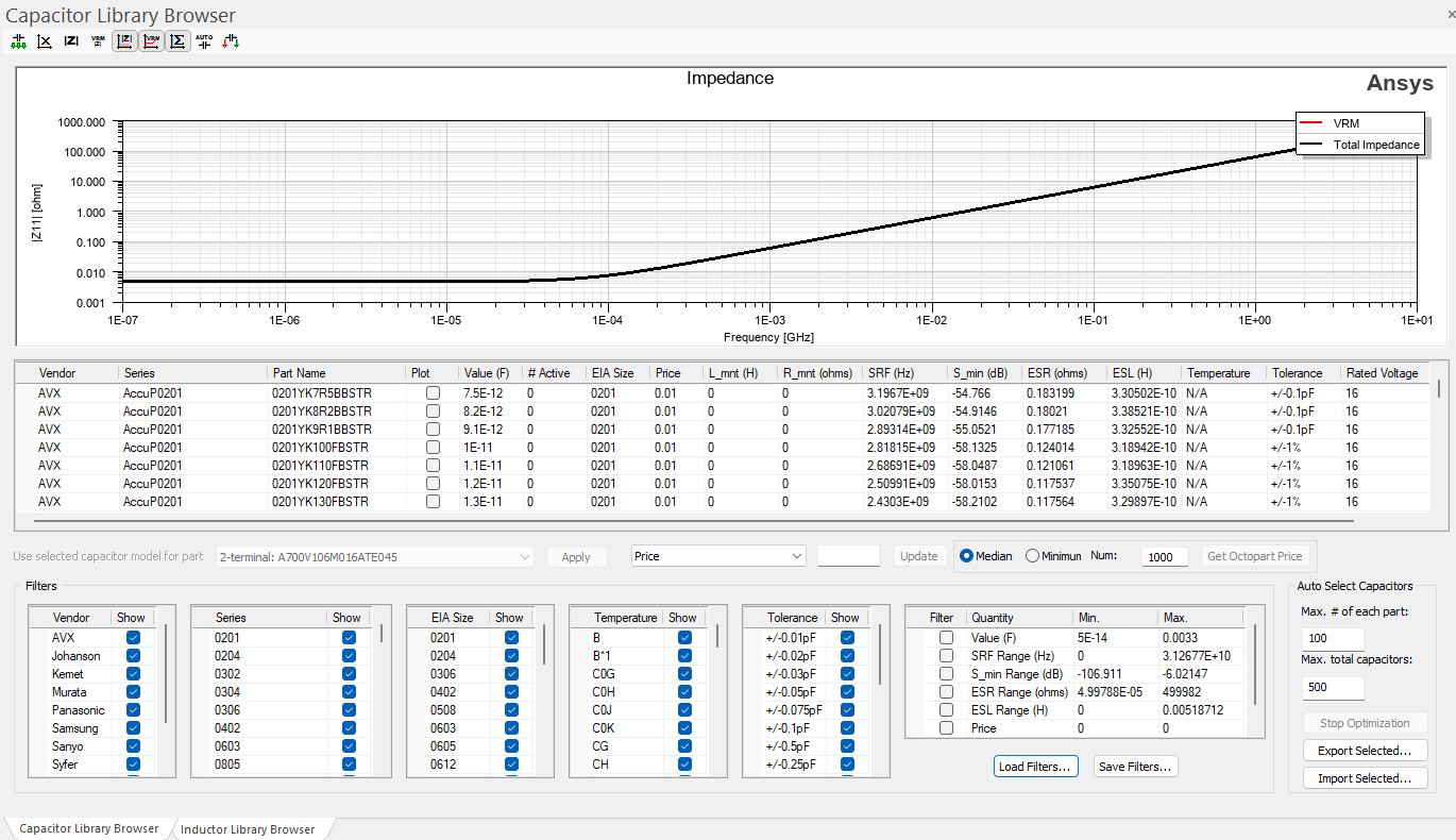 After selecting the capacitor network, run a PI analysis using the PI Wizard in SIwave to ensure that the board impedance (Z_board) stays below the target impedance (Z_target) calculated earlier.