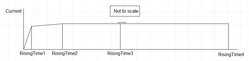 In most AC applications, the current demand varies with time. It typically rises from zero to about 90% of its maximum value within a very short period, referred to as RisingTime1 (for example, 0.8 ns). It then increases to 99% of the maximum current over an intermediate period, RisingTime2 (typically around 50× RisingTime1), and finally reaches 100% after a longer period, RisingTime3 (approximately 2000× RisingTime1). After this point, the current remains steady for an extended duration, RisingTime4, which is roughly 300,000× RisingTime1.