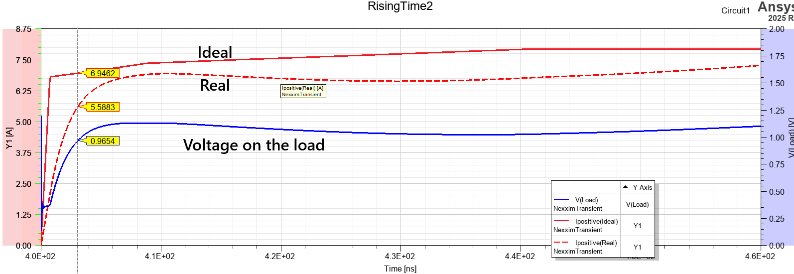 The resulting plots show the ideal current, the actual current delivered, and the voltage seen by the load — allowing designers to confirm real-world performance against theory.