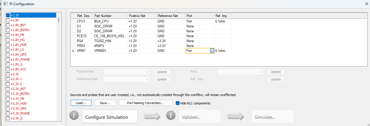 4. If many power nets or signal nets are selected, save the setup. Click Configure, then Validate. SIwave will automatically place the ports. You can review them under Home > Circuit Element Parameters.