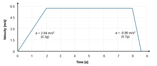 - Maximum acceleration of 0.3g (2.94 m/s2) during 2 s