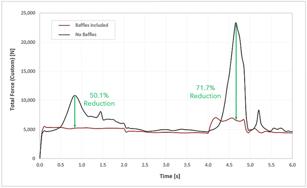 The total force on the tank walls and baffles was obtained as the square root of the sum of squares of the three Cartesian components (Fx, Fy, Fz). In the configuration without baffles, sharp force peaks appear during the acceleration and deceleration phases, as the liquid is free to move along the entire tank length. The addition of baffles leads to a significant reduction in these forces, and alternative designs can be evaluated to achieve the desired stress levels. The animations were generated in Ansys FreeFlow and show the acceleration and deceleration for each configuration.