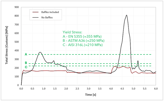 A similar trend is observed in the total stress plot. Here, the total stress is calculated as the square root of the sum of squares of the SPH normal and tangential components (Sn, St). As expected, the force peaks produce high stress levels in the tank without baffles, exceeding the yield strength of some steels commonly used in liquid transport tanks. The results also clearly demonstrate how the inclusion of baffles helps maintain stresses within acceptable limits.