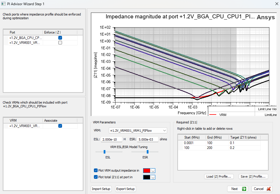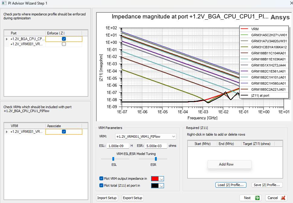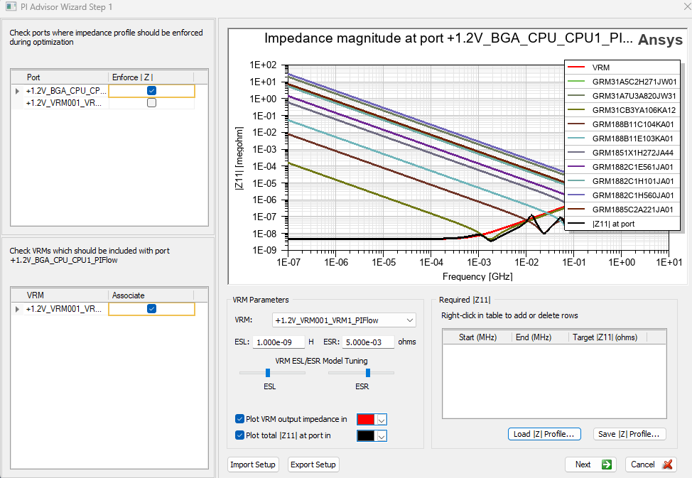 Enter the VRM output impedance, which will replace the VRM port in the optimization process.