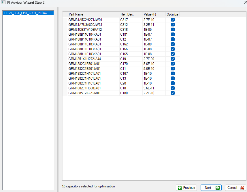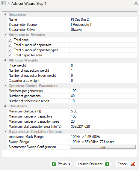 Select which attributes the PI Advisor should optimize (e.g., impedance, capacitor count, cost).