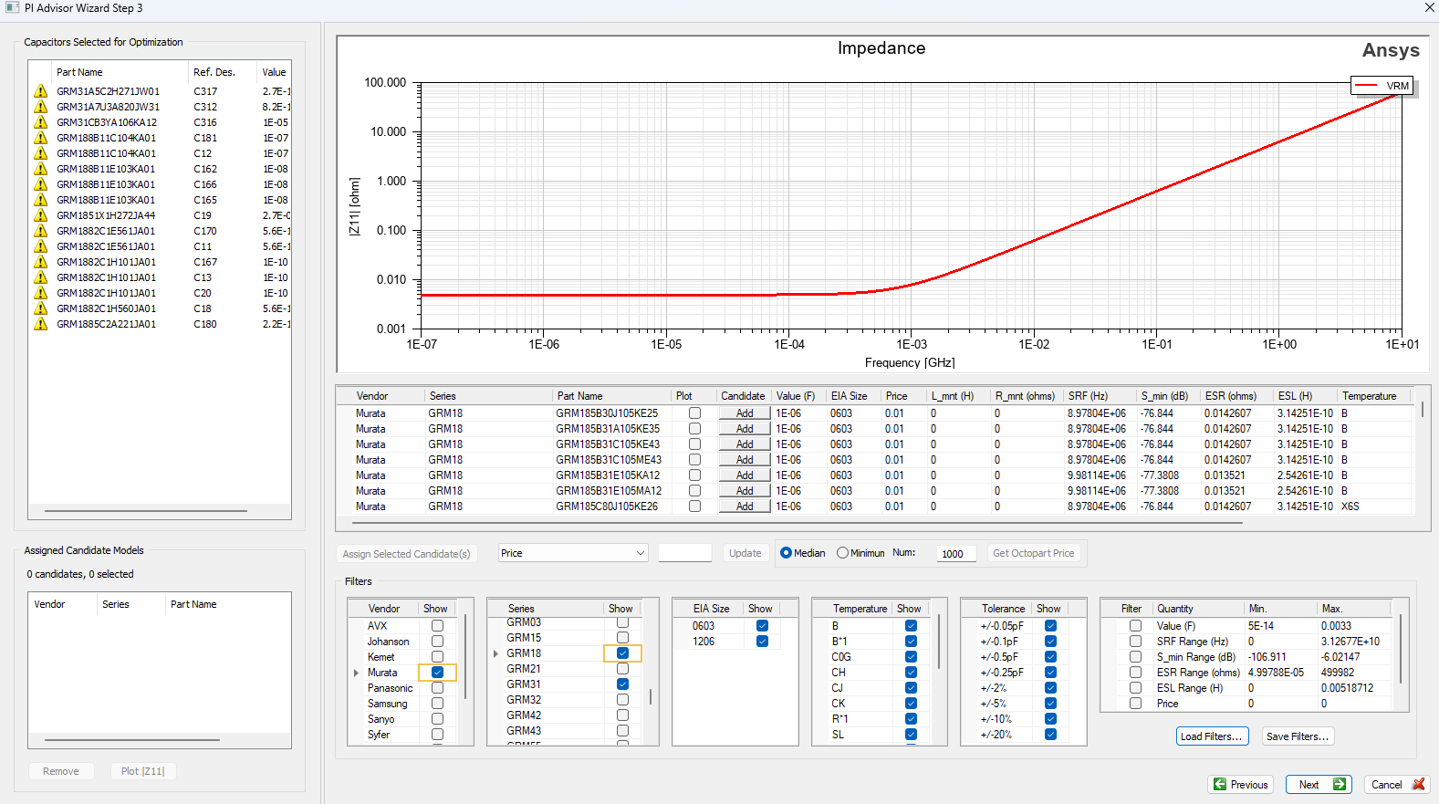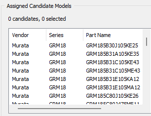 This assignment means that any existing capacitor in the design may be replaced with any of the selected candidate values. Users may also divide the existing capacitors into groups and assign separate candidate lists to each group. Repeat this process for all groups as needed.