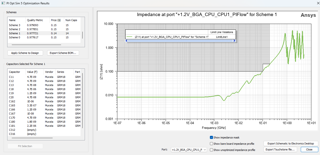 SIwave is a full-wave Power Integrity (PI), Signal Integrity (SI), and Electromagnetic Interference (EMI) analysis tool. It can model, design, verify, optimize, and debug PI/SI/EMI behavior in PCBs, packages, IC-substrates, and dies (or any combination of them). One of the most powerful features in SIwave is the PI Advisor. PI Advisor evaluates the PDN impedance and recommends the optimal number and values of decoupling capacitors needed to meet a specified target impedance.
