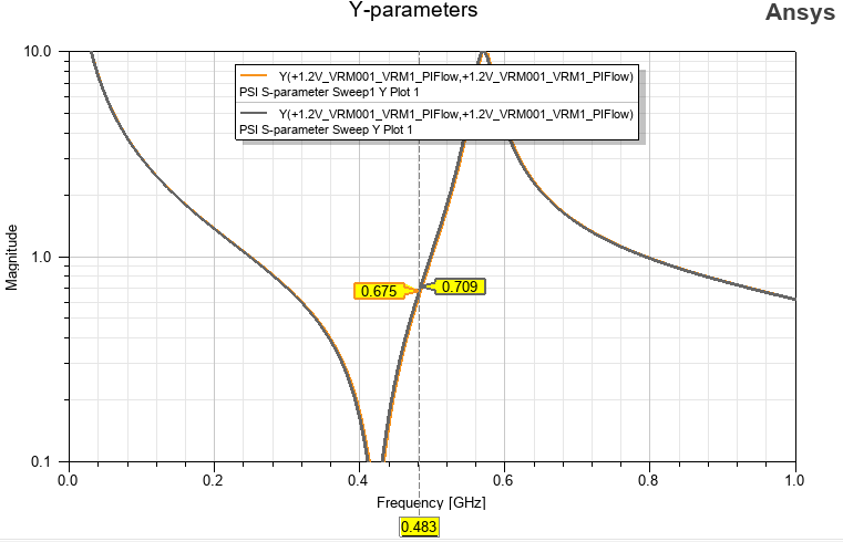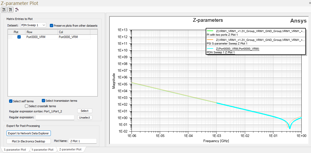 The plot below illustrates the output of the Standard SYZ solver, the PSI solver, and the PDN Channel Builder solver. PDN Channel Builder matches the Standard SYZ solver because that is the solver we selected for this run.