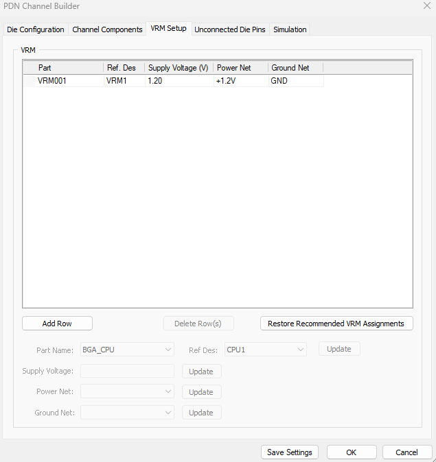 In the VRM panel, enter the VRM component name—or the name of any other die acting as a source. SIwave automatically identifies the correct power net.