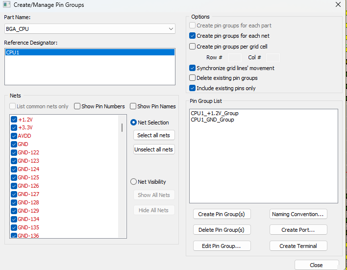 Pin groups can be created using Tools → Create/Manage Pin Groups.
