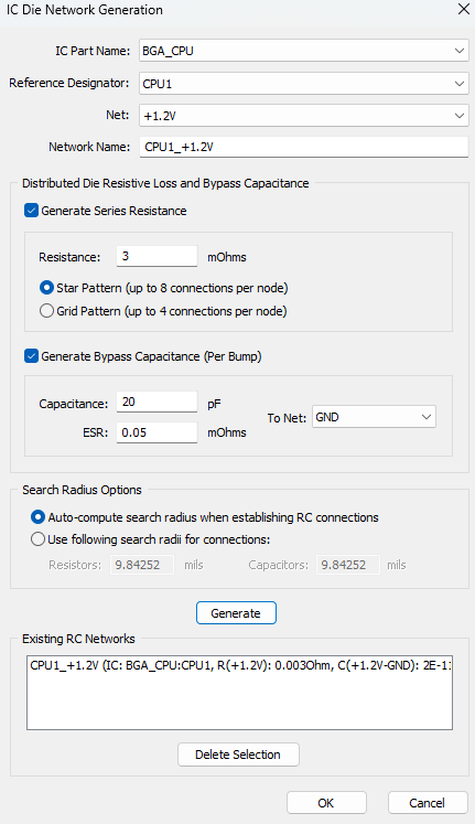After clicking Generate, SIwave creates a new RC network model for the selected die. This model is not directly visible to the user, but the PSI solver automatically incorporates it during simulation.