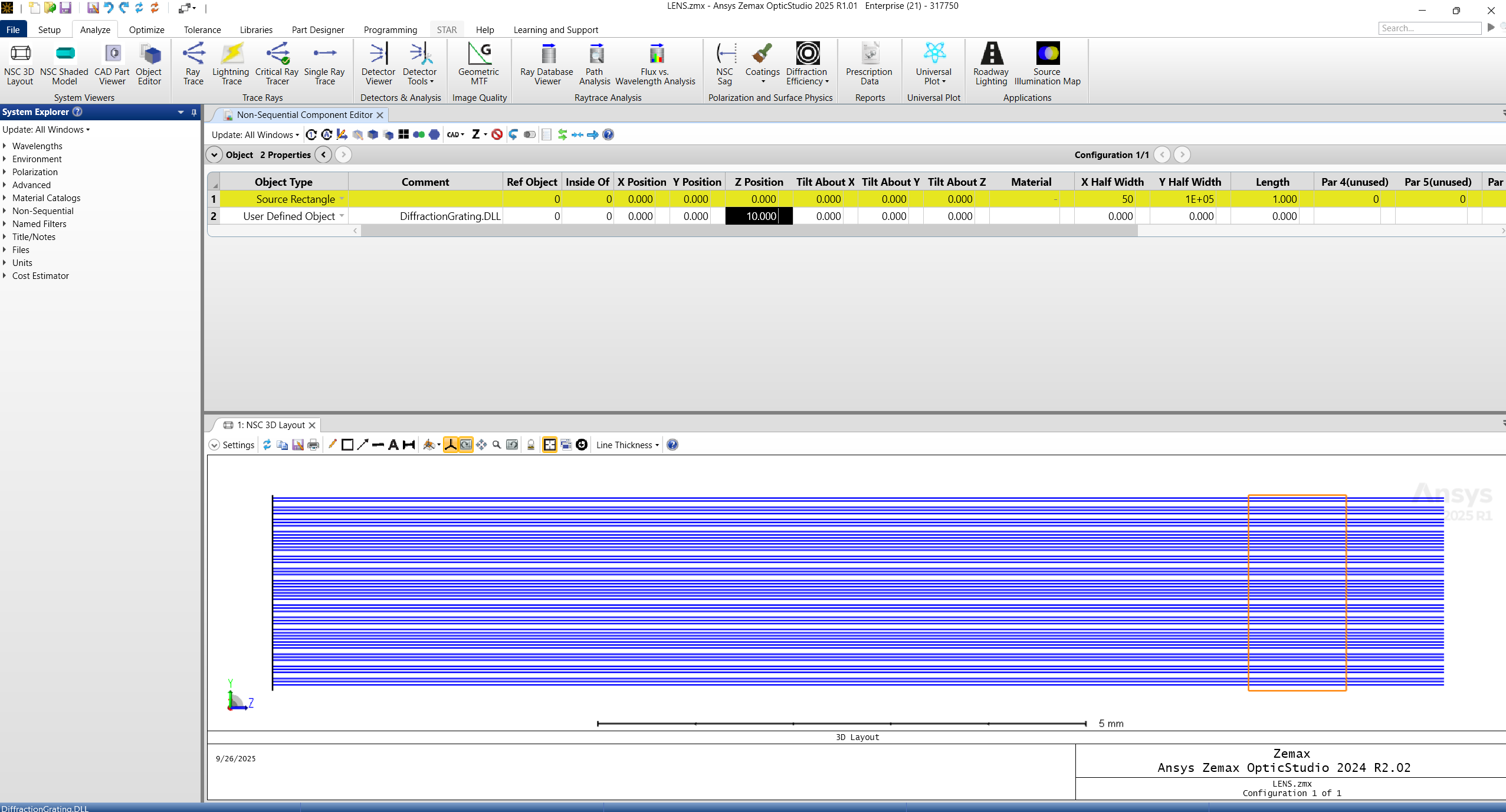 Open a fresh Ansys OpticStudio Zemax session. Navigate to Non-Sequential Mode. Insert a Rectangular Source Rectangle at (0,0,0), (X,Y,Z) . Insert a 2nd Object "User Defined Object" and select "DiffractionGrating.DLL" for the Data File, and press OK.
