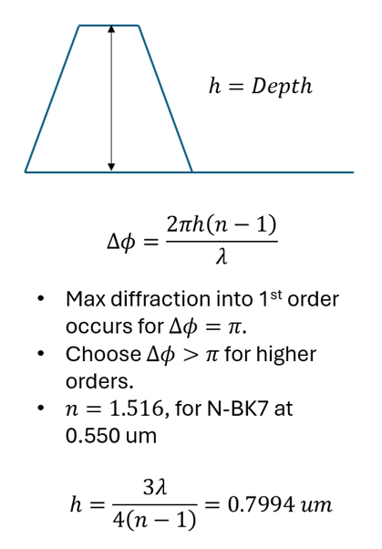 4. Depth (um): Depth is the grating height in um. The Depth for trapezoidal gratings determines the phase modulation of the diffracted light. Often slightly shallower depths than rectangular gratings for easer fabrication and smoother diffraction. A good rule of thumb is to keep the depth <= to the period or 0.2*wavelength/(n-1) < Depth < 1.0*wavelength/(n-1). The Lower limit is to allow enough phase modulation to start producing significant diffraction. The Upper limit is to allow a Full 2pi phase shift -> max efficiency into the chosen diffraction order. The Trapezoid slope spreads the phase linearly, but the overall height difference is what determine the total phase swing.