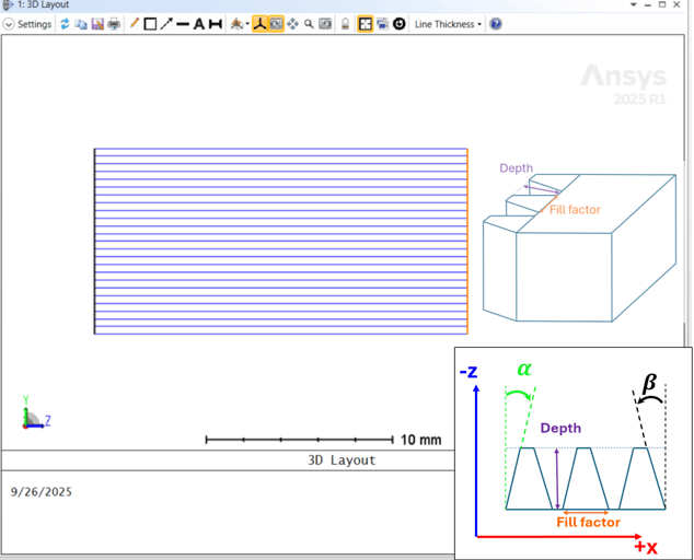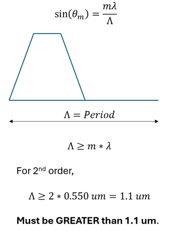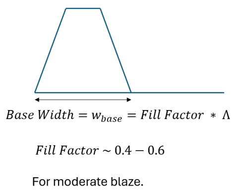 5. Fill Factor: is a dimensionless number between 0 and 1 that represents the ratio of the grating's bottom (base) width to its period. It plays a key role in shaping the trapezoid's sidewall slope and consequently its diffraction behavior. A smaller fill factor produces narrower bases and steeper slopes, effectively "blazing" the grating to direct light into a referred diffraction order, while a larger fill factor yields wider bases and more symmetric diffraction. Defines overall "blaze potential".