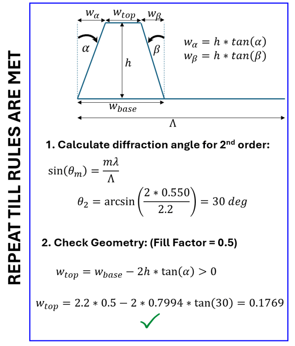 - Avoid +/-90 deg. Slopes too shallow (<5 deg) may be inefficient; slopes too steep (>75 deg) are hard to fabricate and can cause RCWA convergence issues.