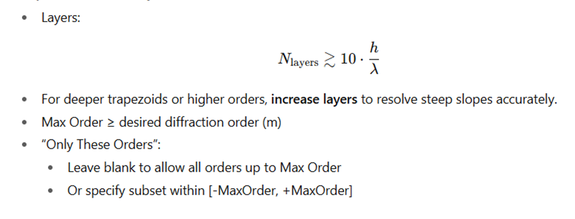 3. Max Order: This is the resolution of the grating's electromagnetic field internally. In other words this defines the internal truncation limit of the RCWA Fourier Expansion. The more you consider here the more accurate, but slower computation time. You can calculate many internal harmonics but choose to trace only a subset use the Start Order and Stop Order. Limit is 10. You can contact the support time to increase to 50. A rule of thumb for the Max Order initial value is to set it equal to 3*(grating period)/(light wavelength).