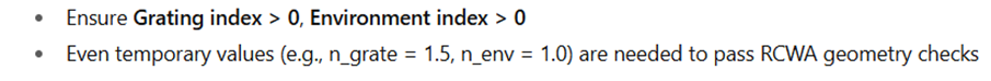 There are rules specific to how the RCWA DLL interprets index values — they don’t change the physical meaning of the grating or environment, just how the software reads them.